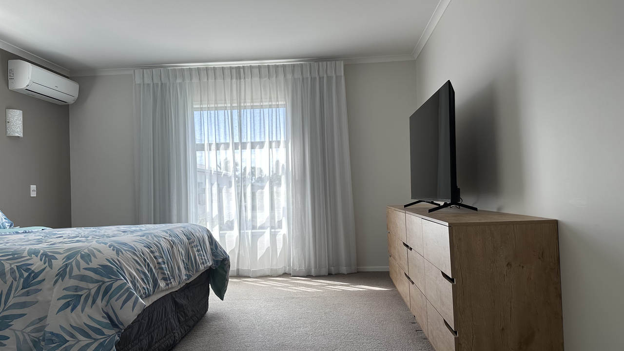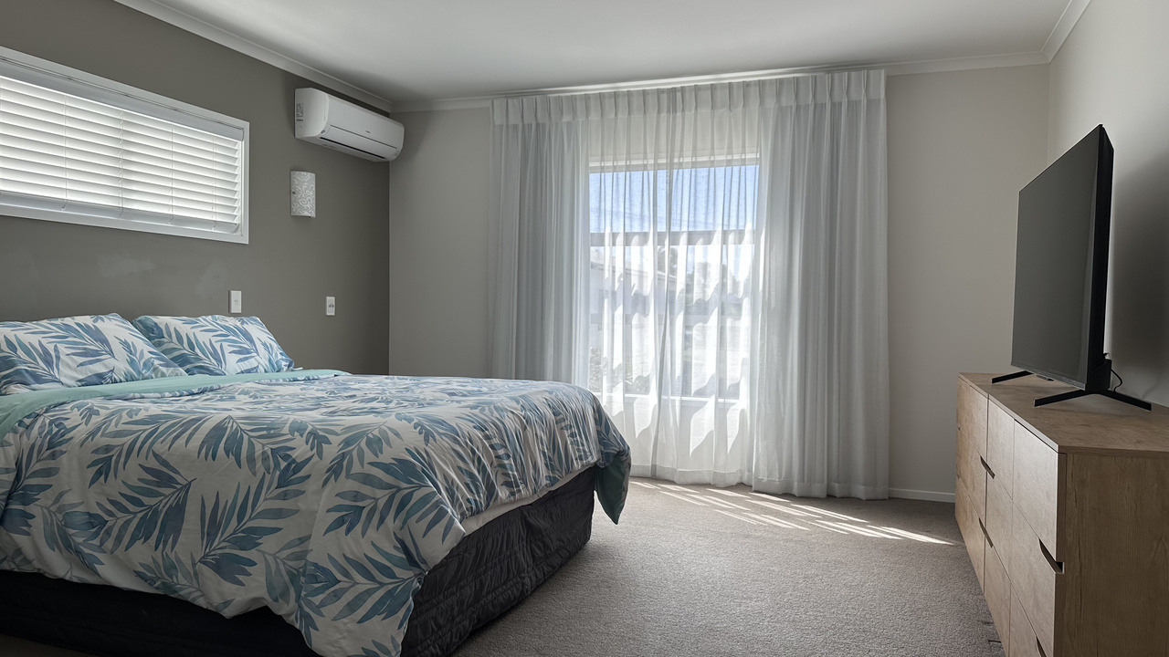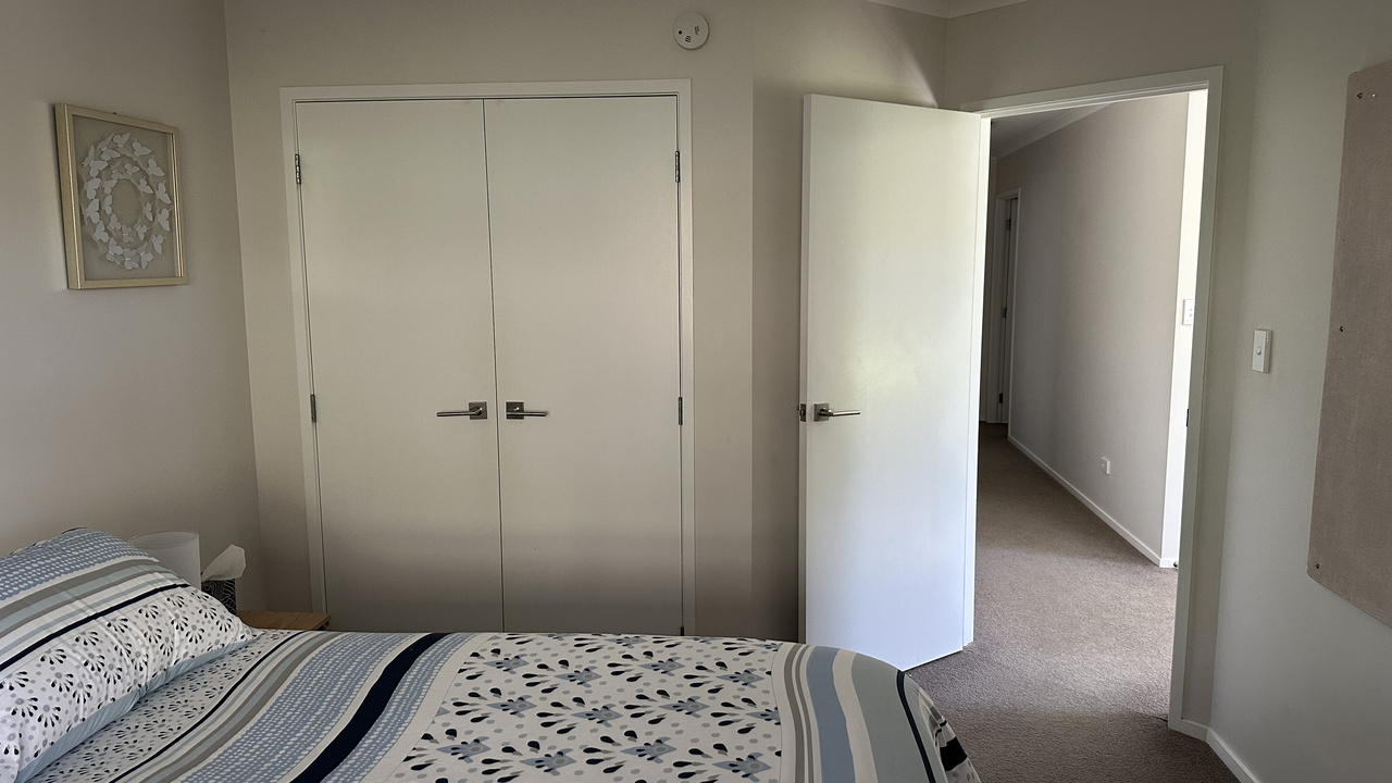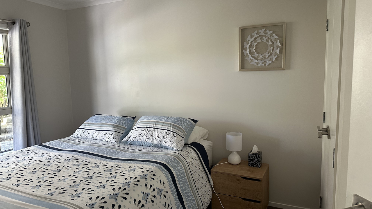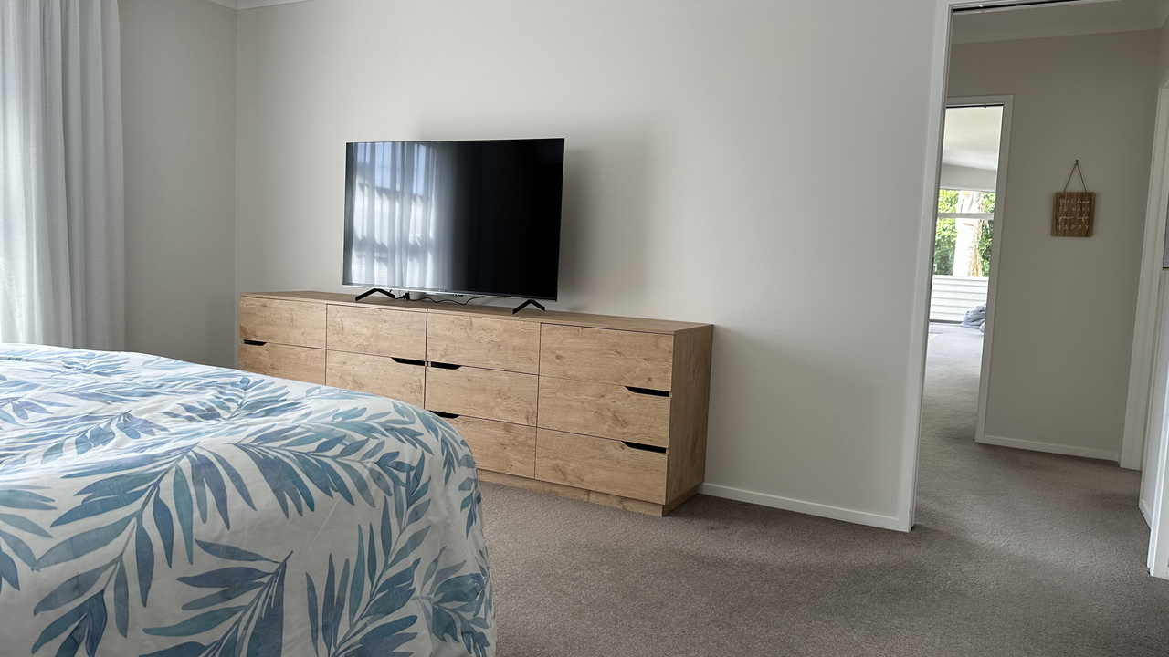 A second bedroom with a king bed in it, and drawers and a closet with plenty of space to hang clothes. This bedroom is less recommended to use, as it is closer to the spa pool and a bit noisier.