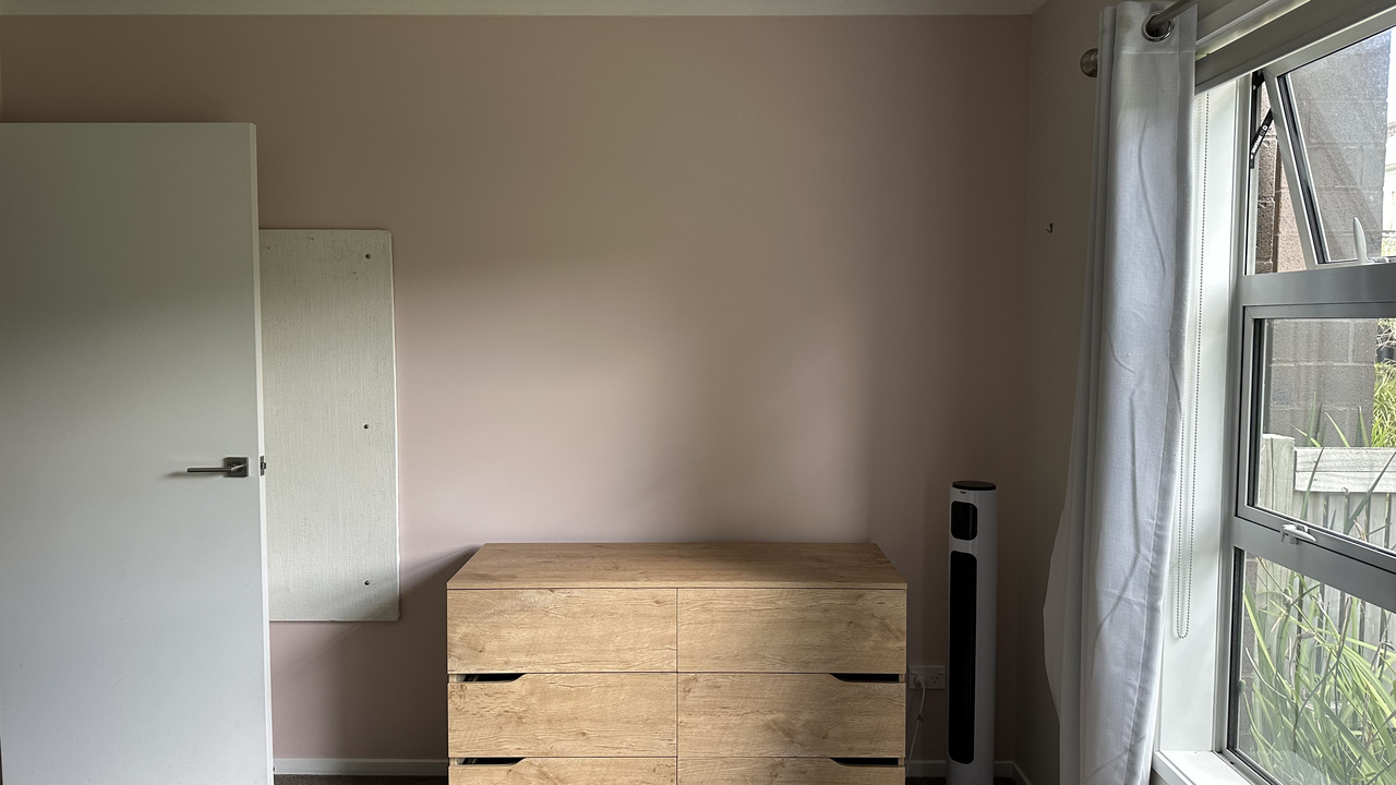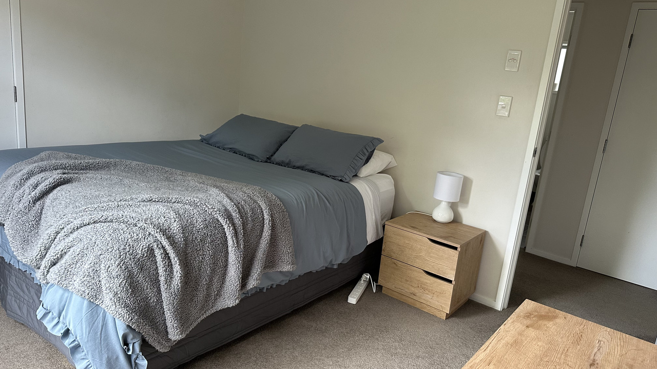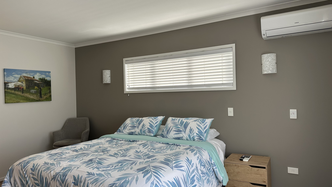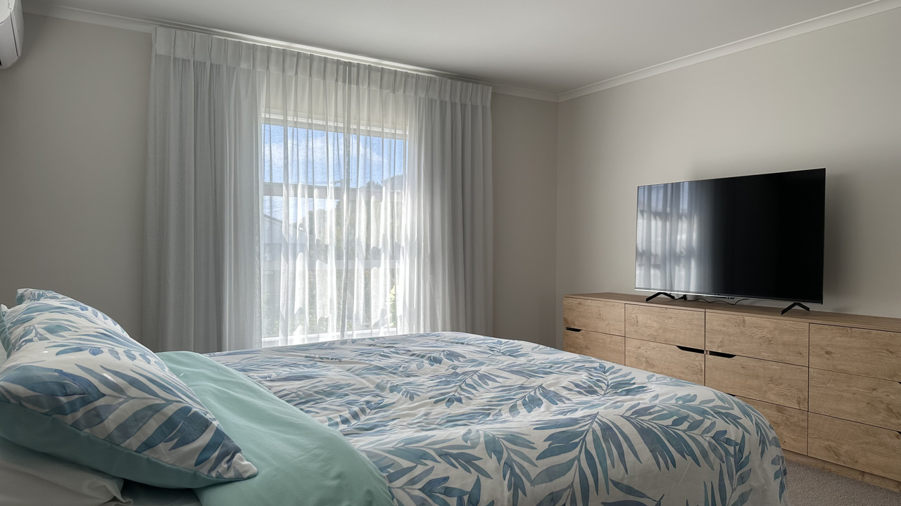 A second bedroom with a king bed in it, and drawers and a closet with plenty of space to hang clothes. This bedroom is less recommended to use, as it is closer to the spa pool and a bit noisier.