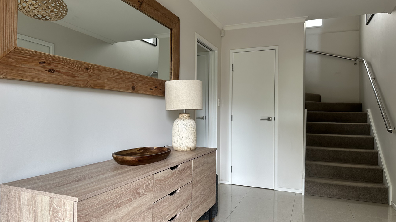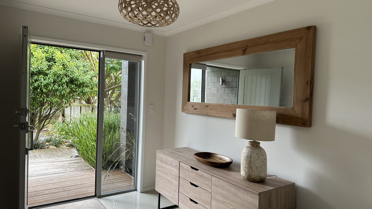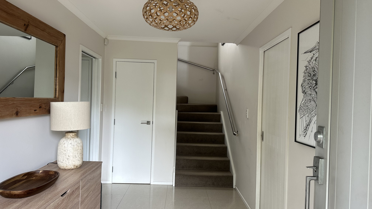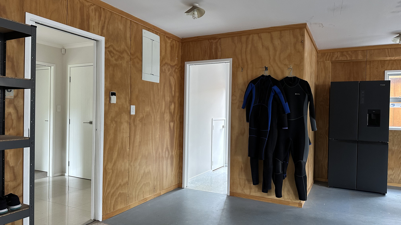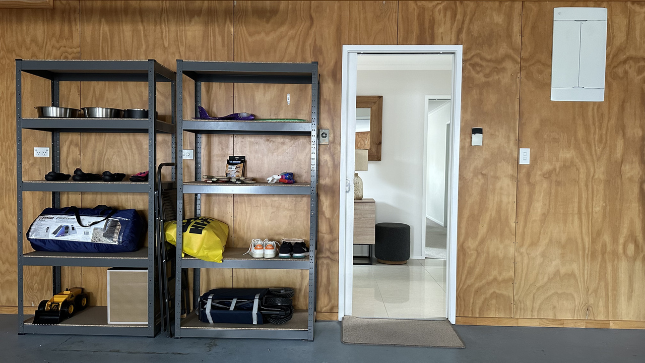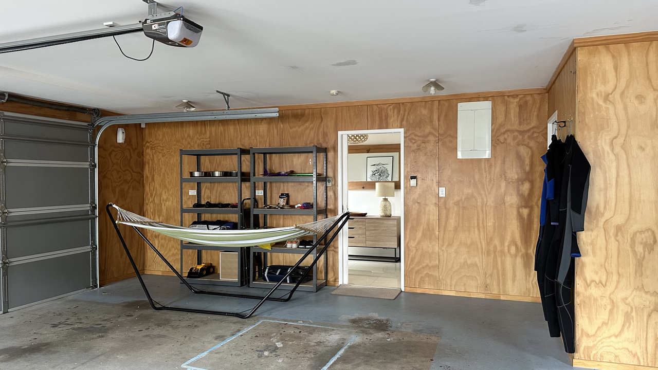 Garage through sliding door on right, and downstairs living areas through sliding door on left.