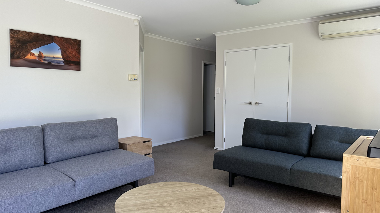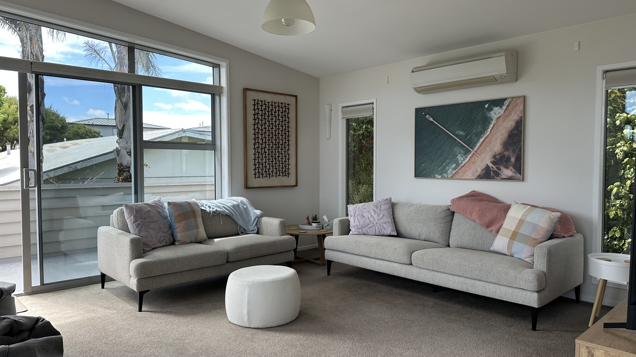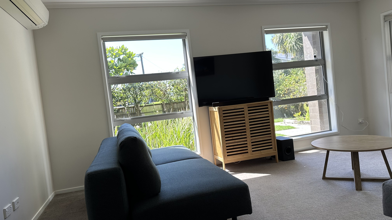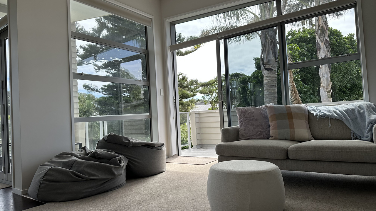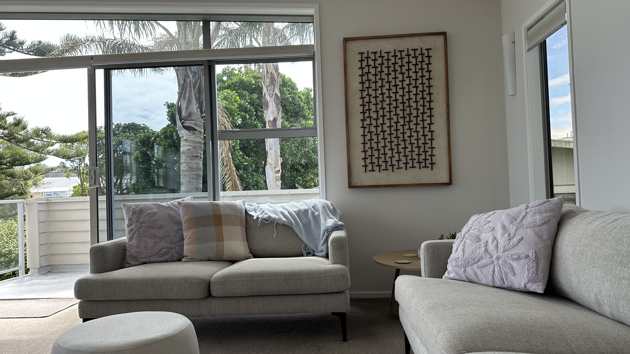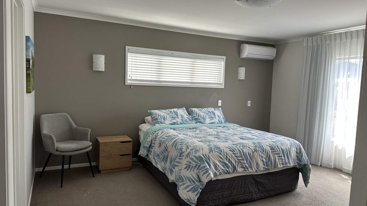 The downstairs consists of the garage on one side, and on the other side two bedrooms with a king bed in them each. There is also a bathroom and toilet, as well as a lounge area that has two couches that can fold down and be used as beds. For guests staying at Molesworth Street, it is recommended that the downstairs bedrooms be used.