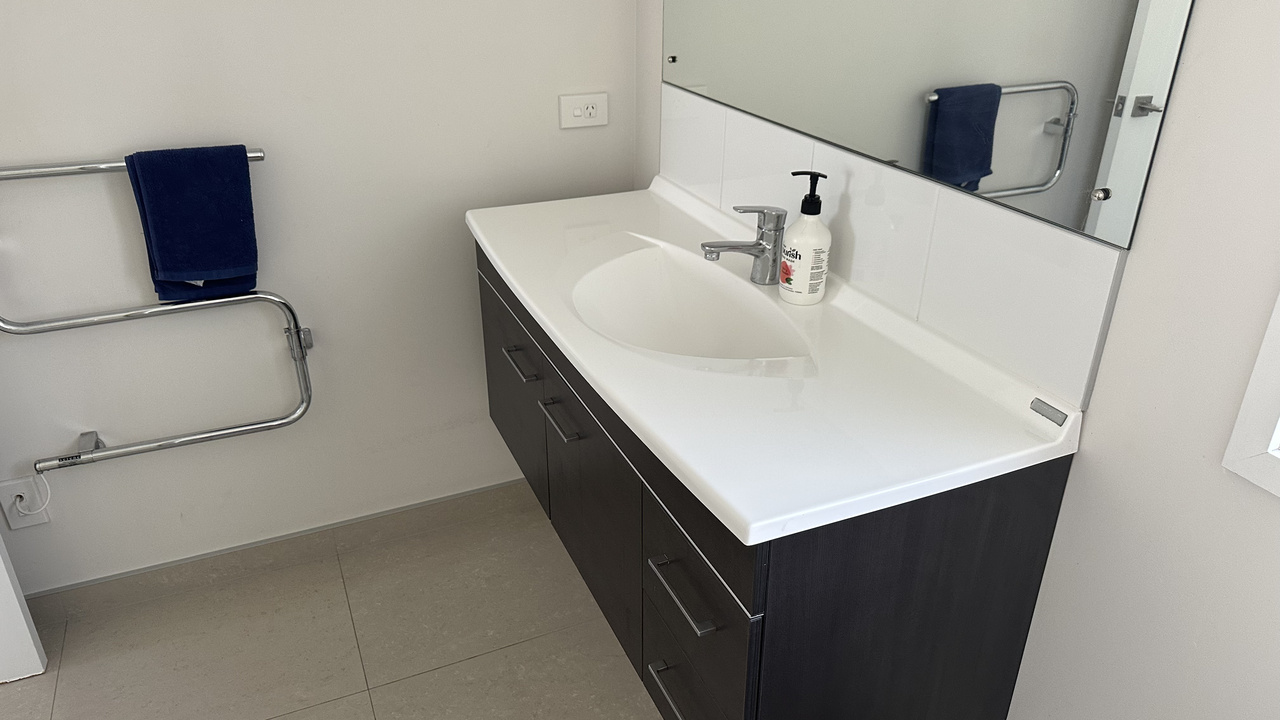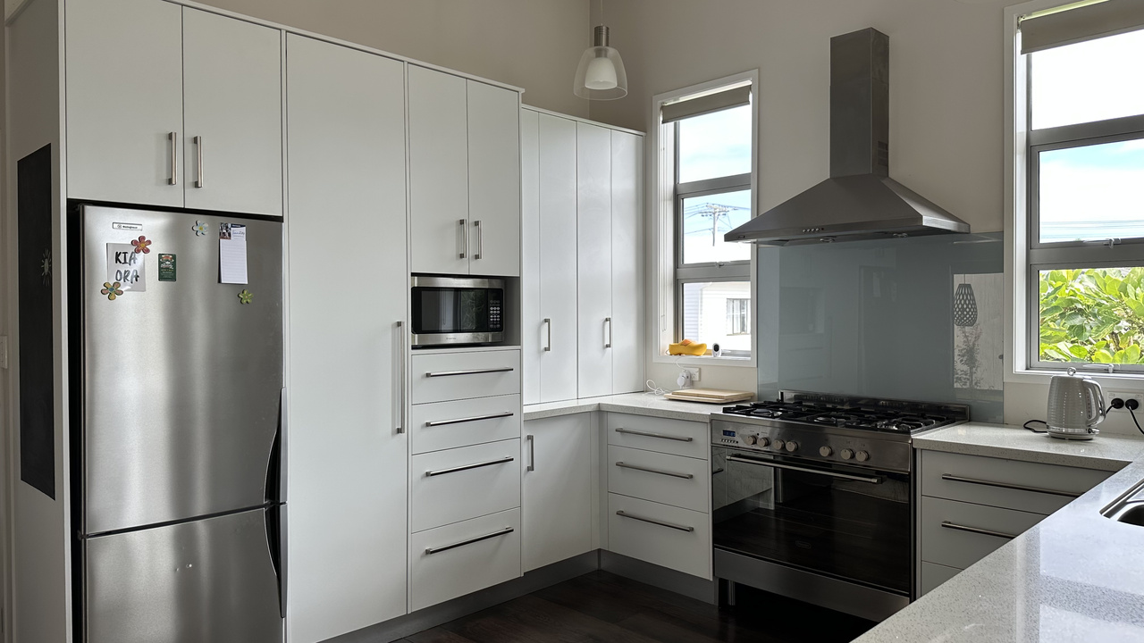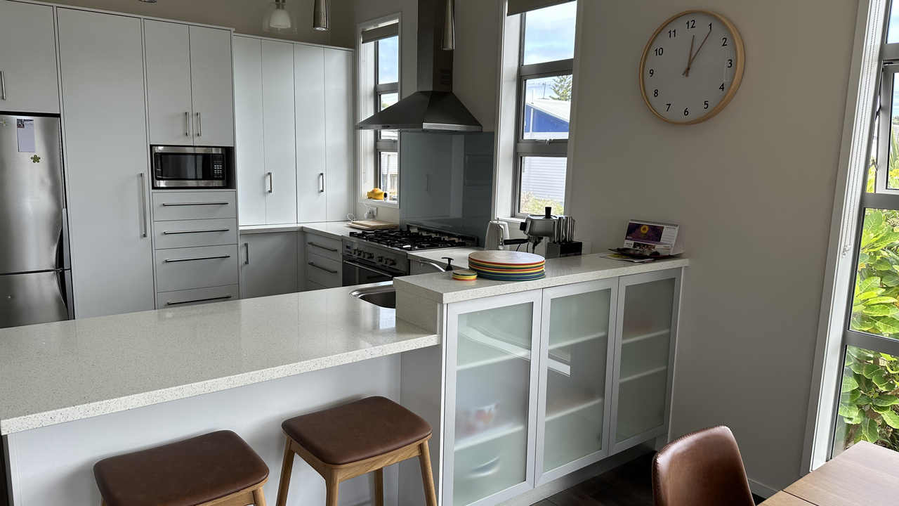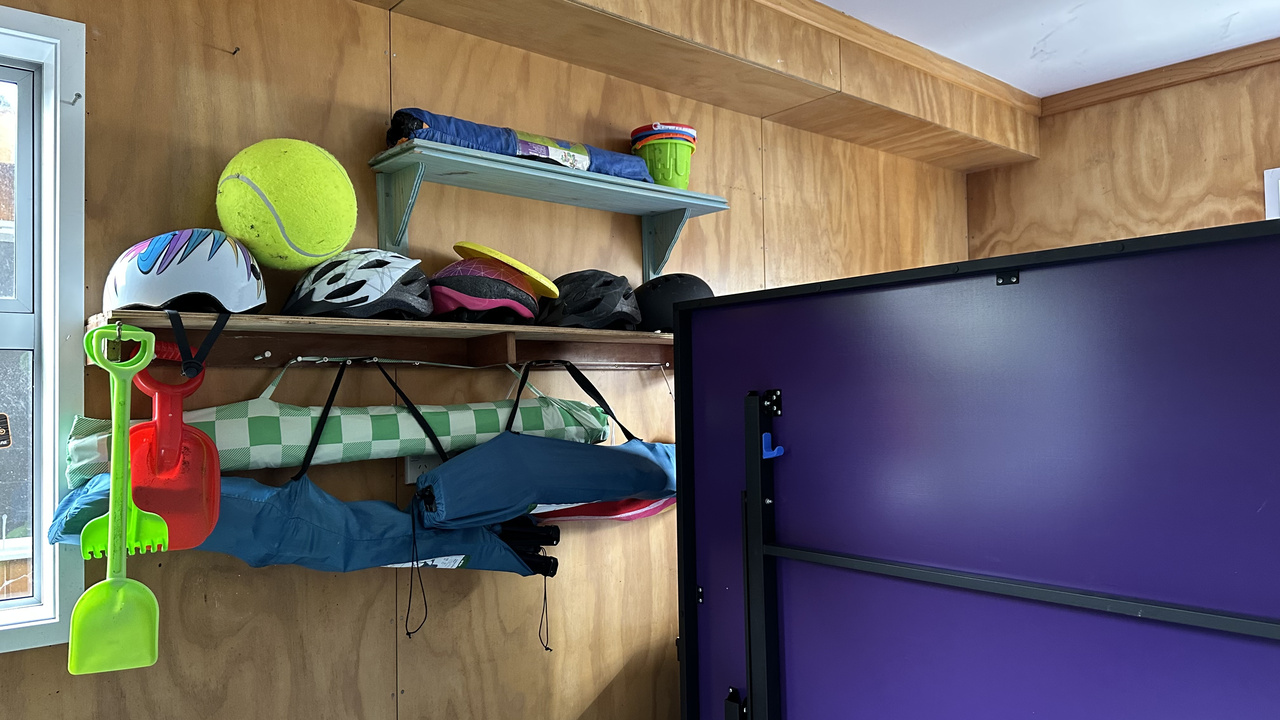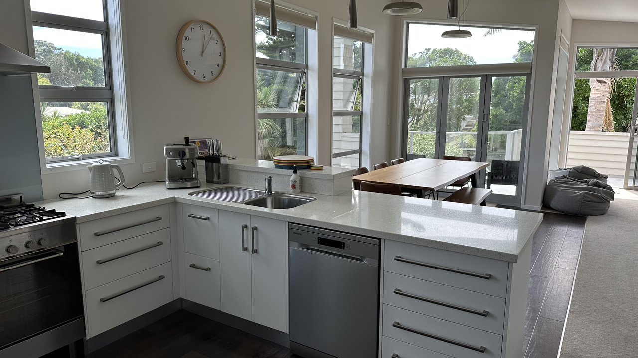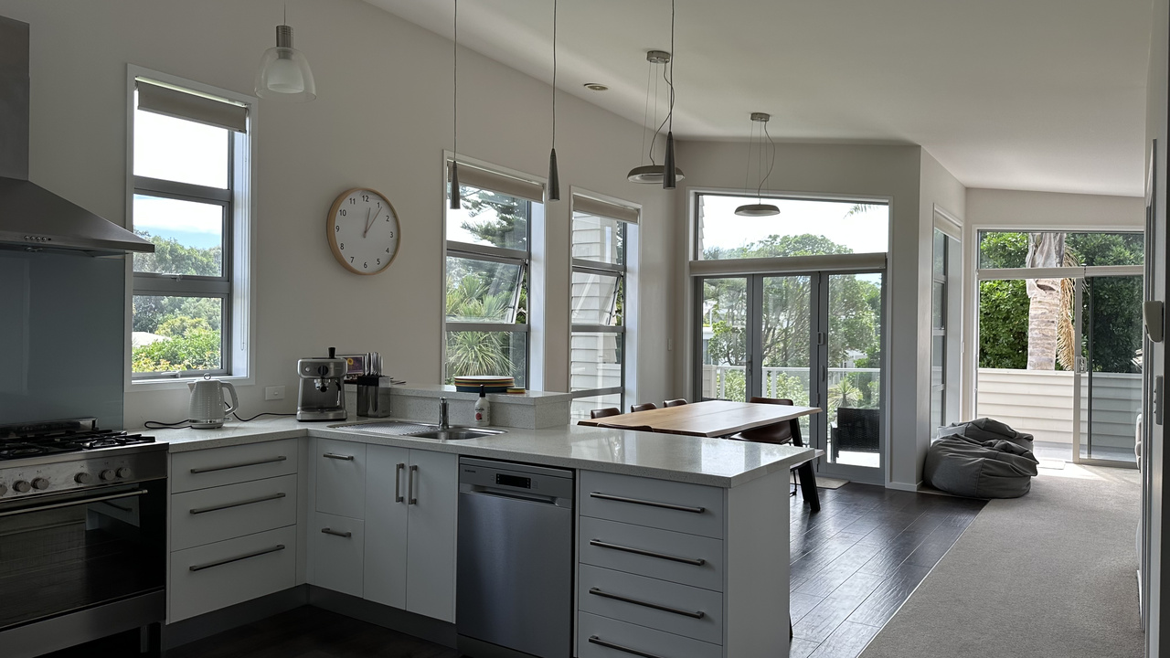 The downstairs consists of the garage on one side, and on the other side two bedrooms with a king bed in them each. There is also a bathroom and toilet, as well as a lounge area that has two couches that can fold down and be used as beds. For guests staying at Molesworth Street, it is recommended that the downstairs bedrooms be used.
