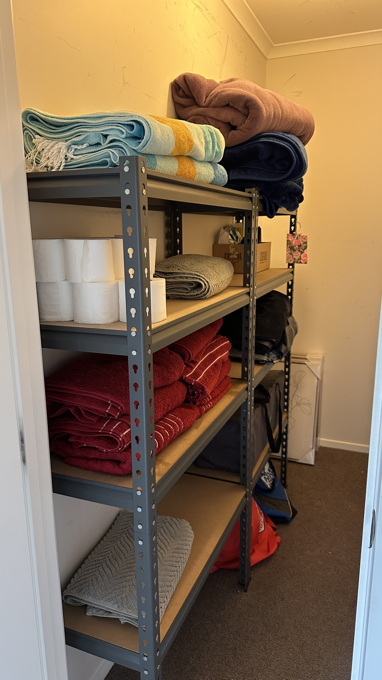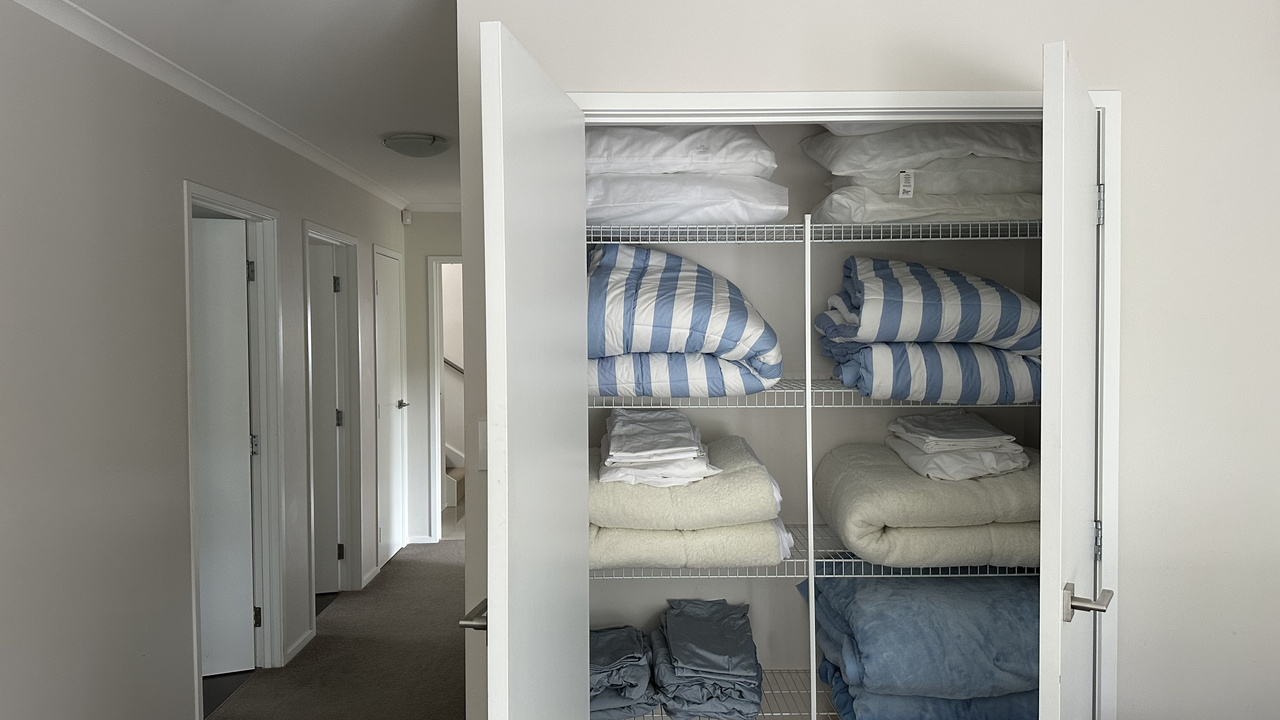 There are two linen closets downstairs - one just after the foyer in the downstairs hallway, and the other in the downstairs lounge cupboard.