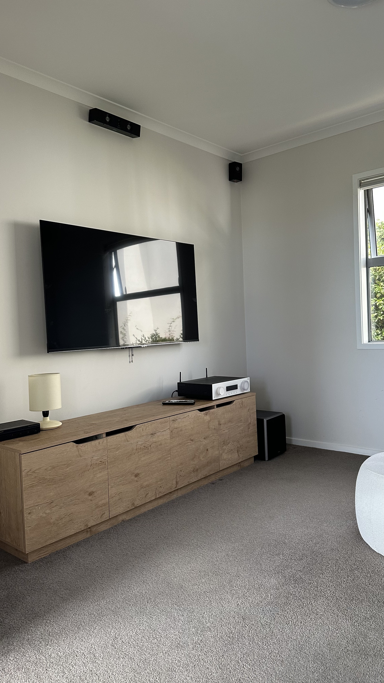 The upstairs consists of the kitchen, dining room, lounge, media room, two bedrooms, the outside decking area, and a small office area.
